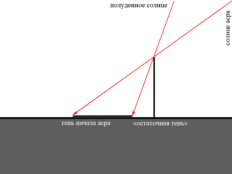 Вернёмся к восходу, но не в равноденствие, а в солнечное солнцестояние. Установим правильную дату на часах: измерительная рейка теперь стоит круче. Солнце восходит севернее точки востока на угол tg A = tg δ / cos φ; на соответствующий угол к северу нужно повернуть плоскость часов, чтобы лучи восходящего солнца падали на него перпендикулярно. В полдень, как и прежде, плоскость часов должна оказаться развёрнутой на точку востока: солнце на меридиане отбросит тень, полностью покрывающую шкалу. Таким образом, в восхода до полудня мы должны немного «подворачивать» диск часов вокруг вертикальной оси, чтобы тень гномона падала на часовую шкалу.