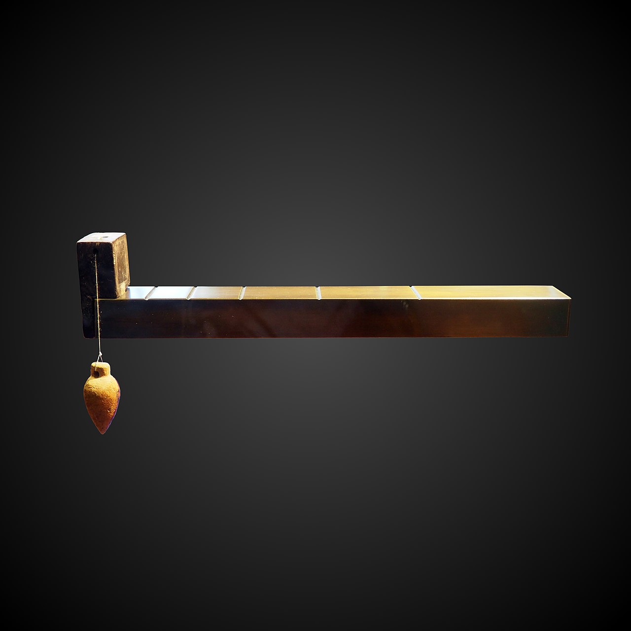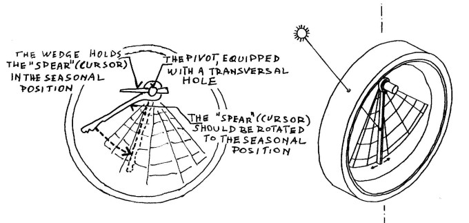 C. Наконец, гномон и измерительная шкала, объединенные в одну конструкцию, «флюгер». Флюгер устанавливается перпендикулярно плоскости часов и вращается на центральной оси; его нужно выставить в соответствии с датой так, чтобы стрелка в основании указывала на нужный месяц треугольной шкалы диска B.