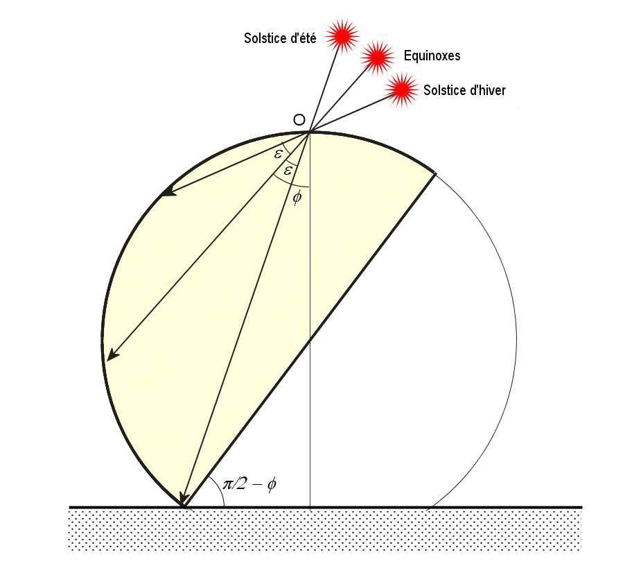 Для начала рассмотрим восход в день равноденствия, когда солнце находится на небесном экваторе и восходит точно на востоке. Часы, настроенные на широту и на дату, развёрнуты на восток: восходящее солнце светит перпендикулярно на плинт часов, и тень гномона падает на его основание. Измерительная шкала установлена под углом к горизонту, совпадающим с наклоном небесного экватора к горизонту (90 - φ), поэтому в течение первой половины дня, пока солнце поднимается к меридиану, гномон продолжает отбрасывать тень на внутреннюю поверхность измерительной шкалы, именно так, как нам нужно, отмеряя время «в хорах». В полдень его тень полностью покрывает шкалу.