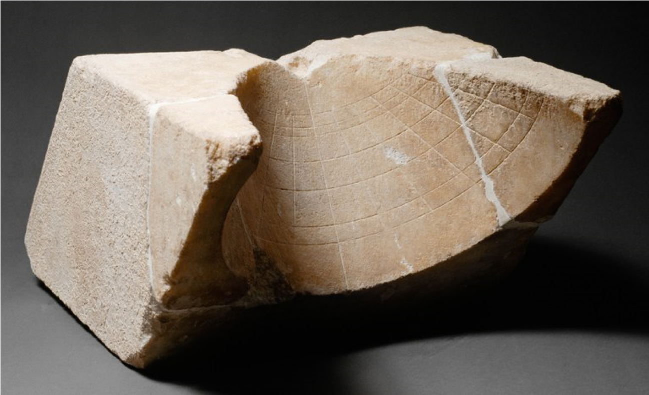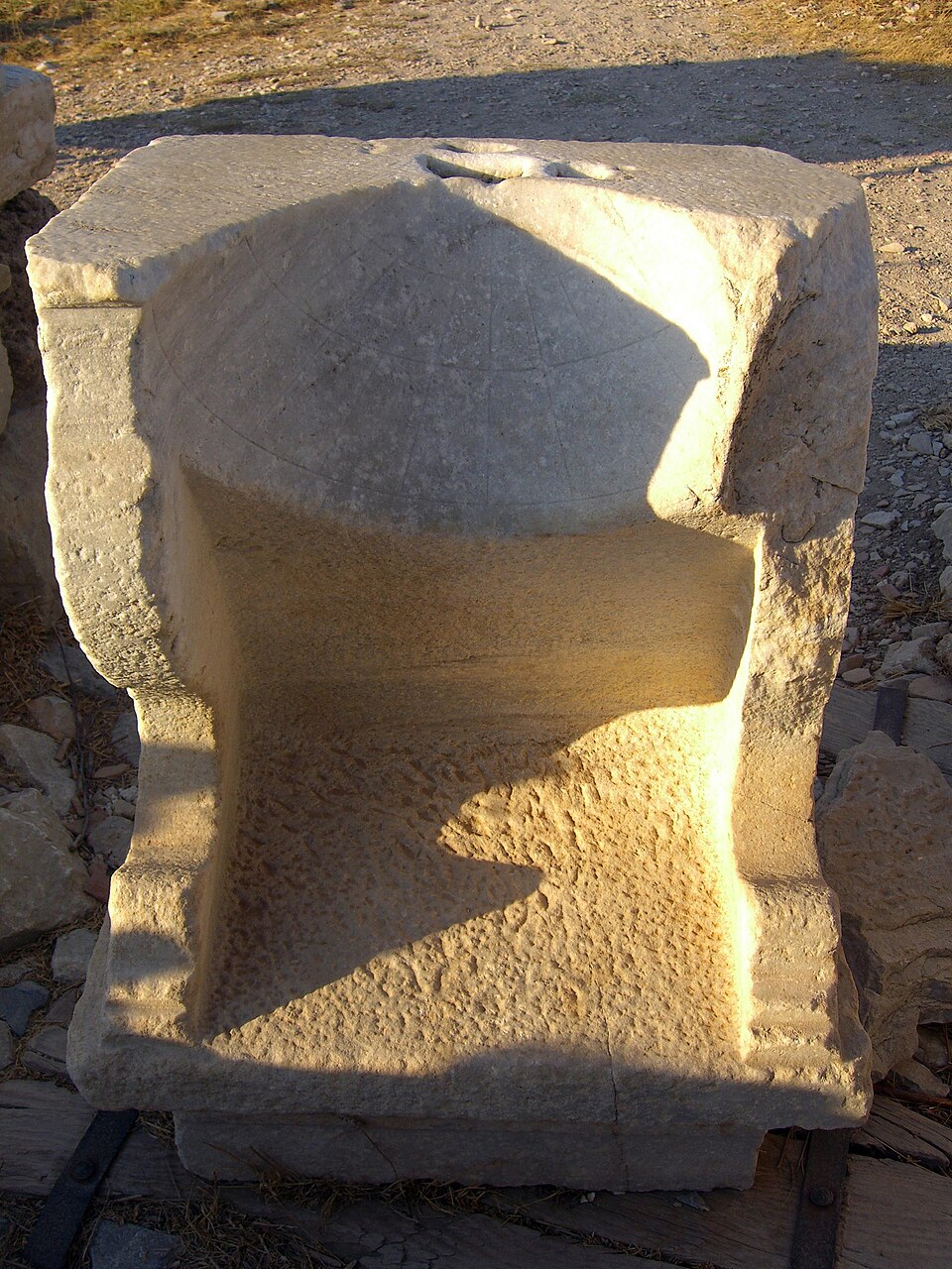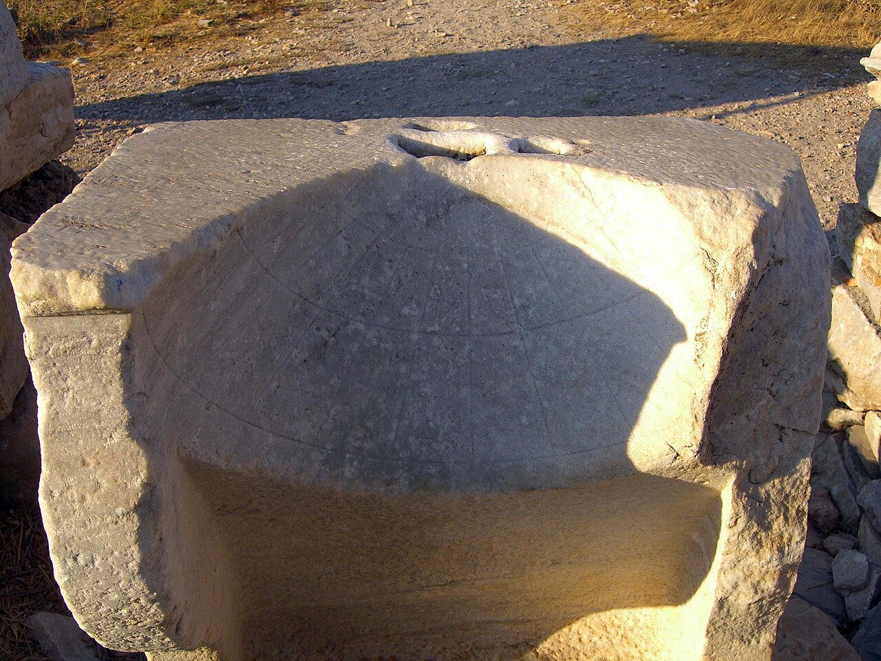 , первым по порядку и приписывает его изобретение вавилонянину Бероссу; тут я вижу анахронизм. Вероятно, Беросс познакомил греков с часами-чашей, самыми простыми солнечными часами полусферического типа, а гемициклы — уже следующий шаг в развитии греческой гномики. Вероятно, они вошли в практику в середине III в. до н.э. и затем использовались повсеместно. Античных солнечных часов-гемициклов археологами найдено очень много. На фотографии в заставке раздела — подобные часы из запасников Археологического музея Стамбула, я наткнулся на них случайно.