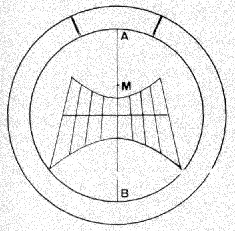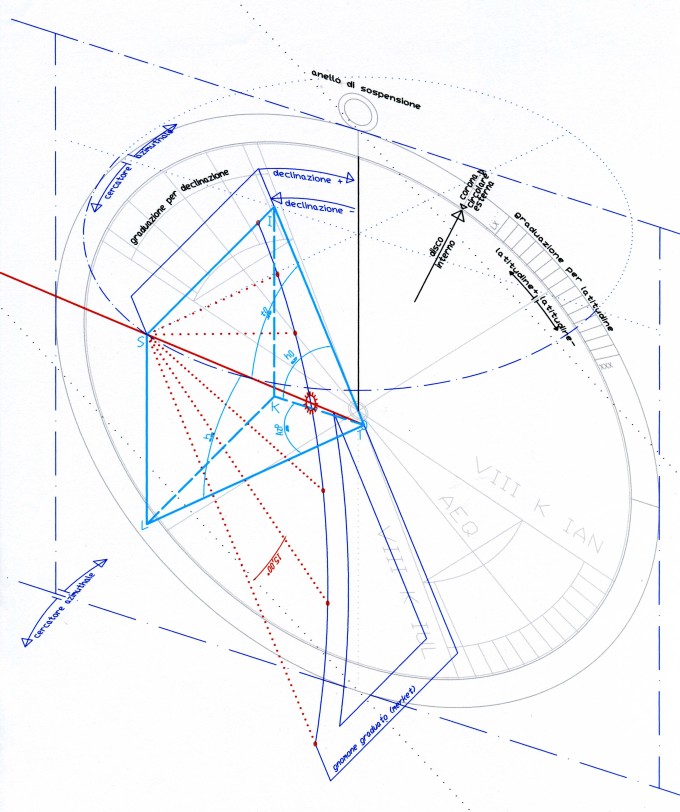 B. Внутренний диск, вращающийся внутри кольца A (аналог алидады); на нём нанесен радиальный маркер, который нужно, вращая диск, установить напротив нужной широты на шкале широт кольца A. Перпендикулярно радиальному маркеру располагается сетка дат в виде двух равносторонних треугольников: чтобы часы показывали правильное время, нужно выставить дату. В треугольнике дат ось треугольника соответствует равноденствиям, стороны — солнцестояниям, зимнему и летнему и остальным зодиакальным знакам соответствуют промежуточные линии.