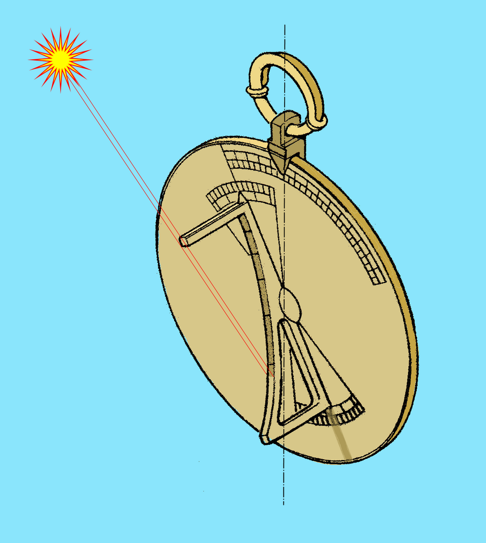 Итак, устанавливаем широту, устанавливаем дату, и часы готовы к работе: поворачиваем их, чтобы тень от гномона падала на внутреннюю поверхность измерительной шкалы и — вуаля! — снимаем время. Но как это работает? (Дальнейшее можно безбоязненно пропустить.)