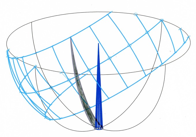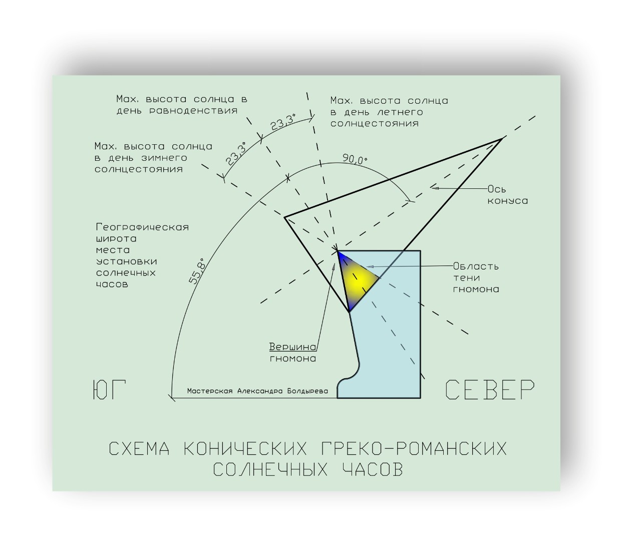 Как размечаются часы? В дни равноденствий солнце движется по большому кругу небесной сферы, и его плоскость сечёт конус окружностью. В остальные дни солнце движется по малым кругам небесной сферы, тень конца гномона формирует в течение дня очень широкий конус. Сечение конуса кадрана соосным конусом тени даёт… тоже окружность. Это не очевидно, но очень удобно.