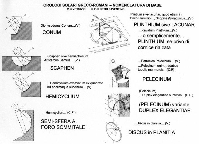 Hemicyclium excavatum ex quadrato ad enclimaque succisum Berosus Chaldaeus dicitur invenisse. scaphen sive hemisphaerium Aristarchus Samius, idem etiam discum in planitia. arachnen Eudoxus astrologus, nonnulli dicunt Apollonium. plinthium sive lacunar, quod etiam in circo Flaminio est positum, Scopinas Syracusius, πρὸς τὰ ἱστορούμενα Parmenion, πρὸς πᾶν κλίμα Theodosius et Andreas, Patrocles pelecinum, Dionysodorus conum, Apollonius pharetram, aliaque genera et qui supra scripti sunt et alii plures inventa reliquerunt, uti conarachnen, conicum plinthium, antiboreum. item ex his generibus viatoria pensilia uti fierent plures scripta reliquerunt. ex quorum libris si qui velit subiectiones invenire poterit, dummodo sciat analemmatos descriptiones.