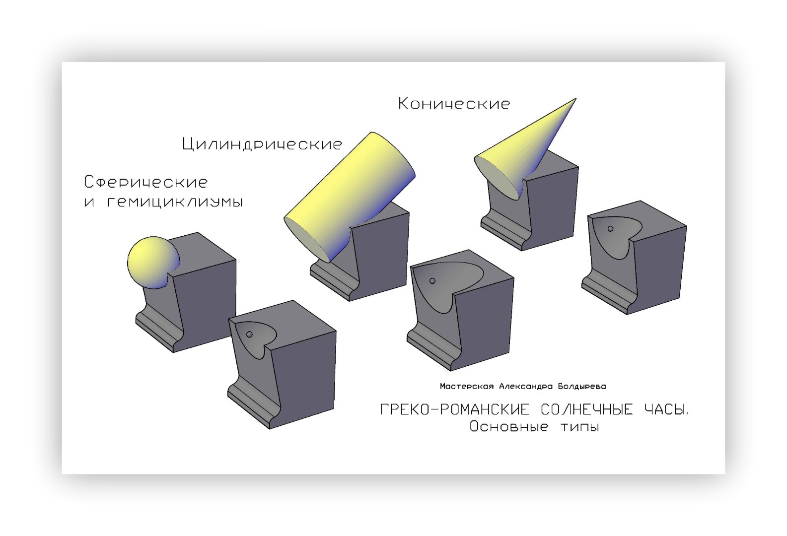 Нам привычны плоские часы с наклонным гномоном, направленным на полюс Мира; но древние плоские часы были с вертикальным гномоном, потомком пастушьего посоха, и размеченным на равные сектора циферблатом. Они обладали невысокой точностью. Так что сначала появились в Вавилоне, а затем получили развитие в Греции более точные солнечные часы других конструкций. Они получившие общее название греко-римских. Первыми такими часами стали сферические часы.