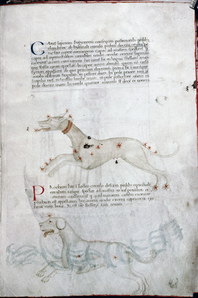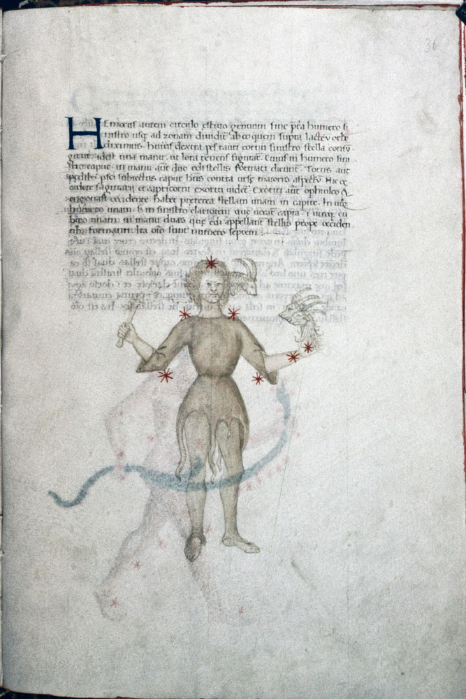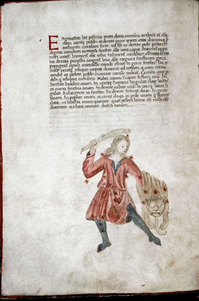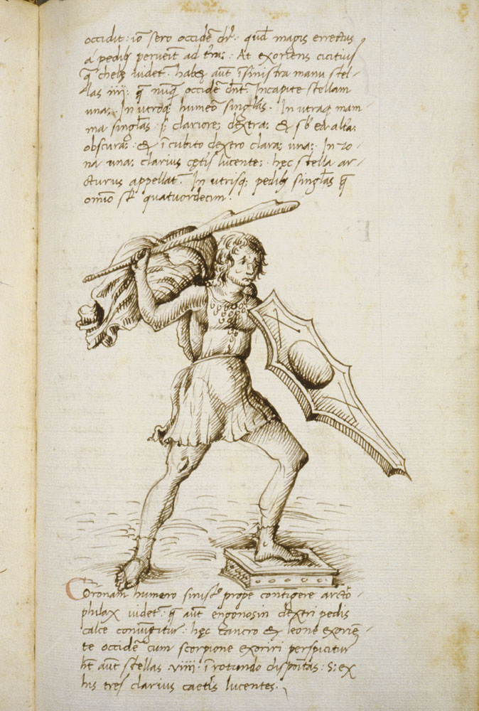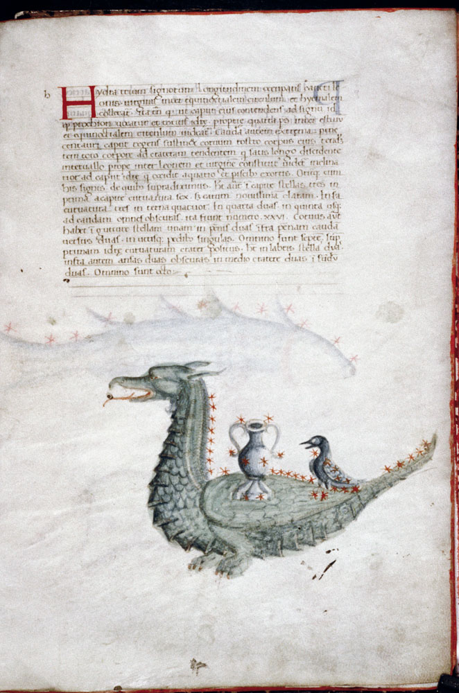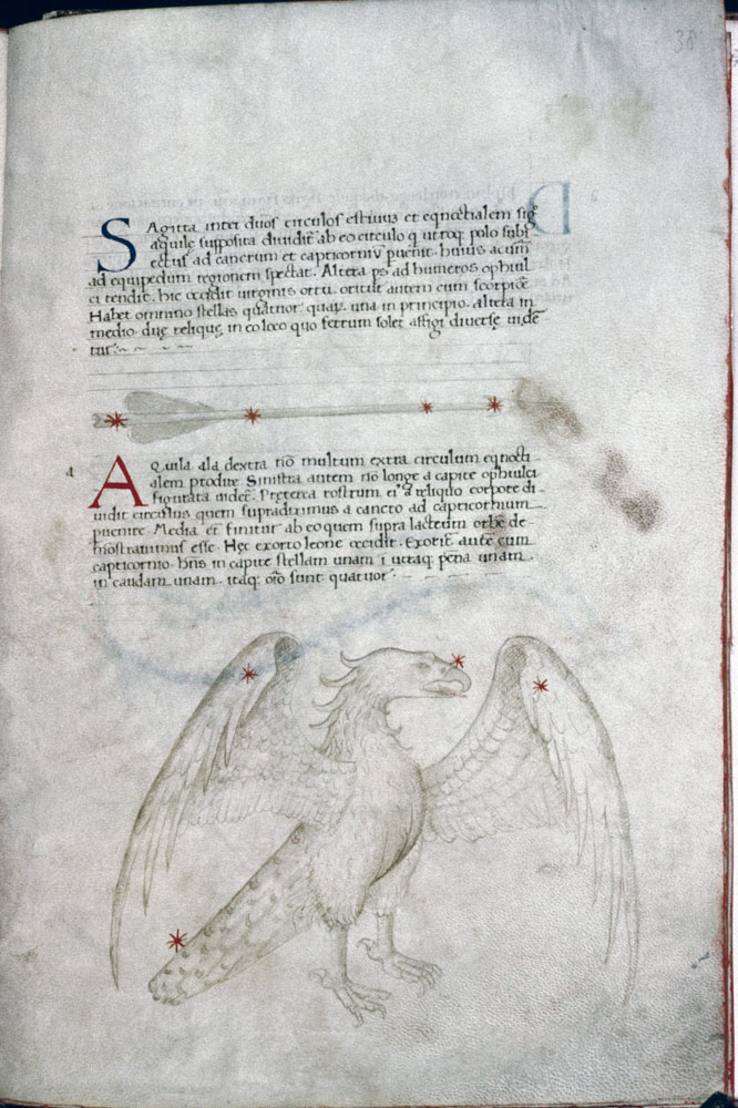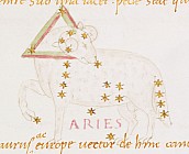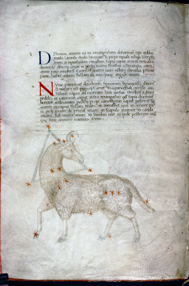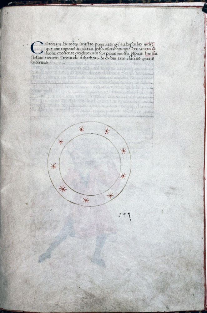 «Аратея», «Явления» Арата Солийского в переводе Цицерона, IX в. (820-840, 830?) Из манускрипта Harley MS 647 («Харлеанский Арат»), коллекции астрологических и астрономических текстов конца IX века - XI в; Франция, Реймс (?). Каллиграммы созвездий — соответствующие описания из «Астрономии» Гигина.