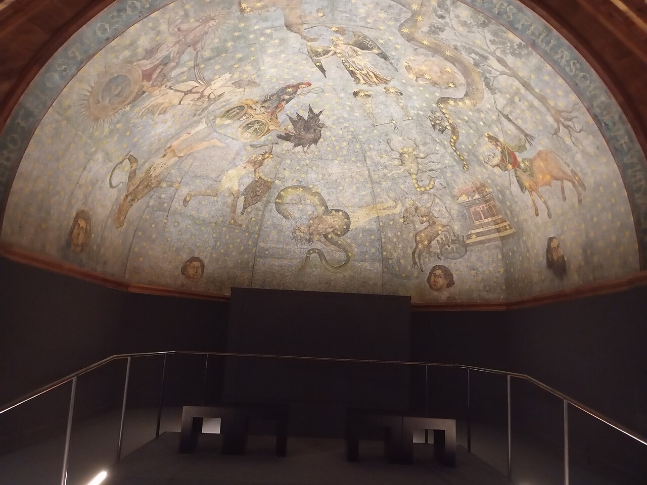 У меня есть определенные сомнения в приведенной выше датировке росписи. Дело в том, что в южной части небесной сферы на росписи мы находим Южный Крест и даже изображения Магеллановых Облаков. Конечно, в принципе, Южный Крест уже был известен; конечно, гео(урано)метрия этой части неба грешит большими ошибками, созвездия сильно смещены (фактически, Южный Крест должен находиться между передними и задними ногами Центавра); конечно Южный Крест вполне условен и выглядит огромным… Однако, Петер Планциус только в 1589 году создает глобус с оформленным в созвездие Южным Крестом (и тоже неверным его положением). В общем, требуется дополнительное исследование этого вопроса и сверка росписи с другими изображениями того времени.