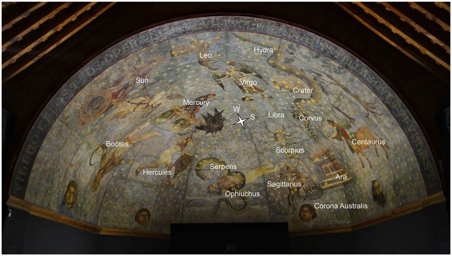 Полная фреска, по свидетельствам современников, содержала все 48 созвездий «Альмагеста», пять планет, светила и четыре ветра. Выполнена она была по «Астрономикону» Гигина, вполне вероятно, выпущенному Ратдольтом в это время. Сохранилась часть, приблизительно соответствующая южной части неба в начале лета. Изображены солнце и Меркурий в виде фигур на колесницах, расположены они вне зодиака, севернее его над созвездиями, которым они соответствуют в астрологическом плане: надо Львом и Девой соответственно. Можно предположить, что и остальные отсутствующие планеты располагались в своих астрологических домах. Таким образом, фреска не должна была отображать какой-то реальный вид неба, а служила скорее иллюстрацией к астрологическим положениям (при этом, как часто бывает, с путаницей созвездий и знаков).