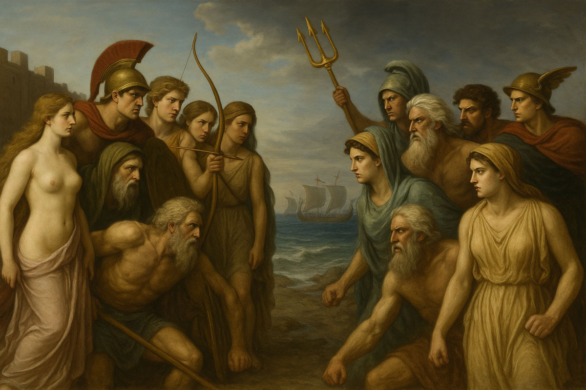 - Посейдон, недолюбливавший троянцев за обман при строительстве стен,