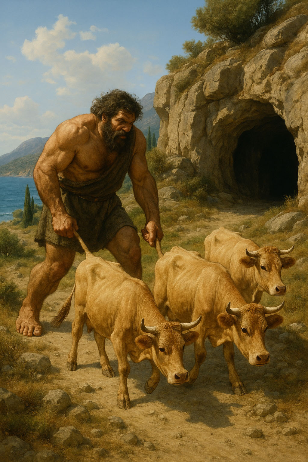 Сам добывший разбоем коров Гериона на дальнем западе, безудержный Геракл возвращался вдоль южного европейского побережья домой в Элладу, он ненароком слишком рано повернул на юг и оказался в районе современного Рима. Там, в пещере на Аветинском холме, одном из семи, обитал великан Какус, людоед и негодник. Позже его стали воображать трехголовым и изрыгающим из глоток огонь, но и без этой фантастики он был достаточно неприятным типом.