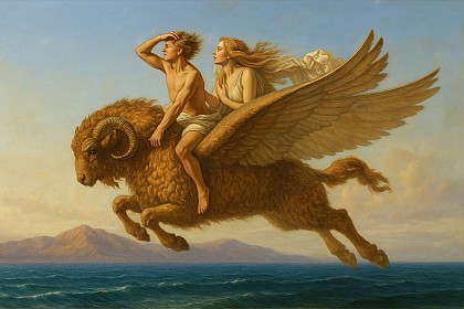 Крий прилетел к Фриксу, усадил его с сестрой Геллой на свою спину и пустился в путь в Колхиду через три моря. Над вторым морем у Геллы закружилась голова, и она упала в залив, отделяющий Европу и Азию, названный после этого «море Геллы» — Геллеспонт (ныне Дарданеллы). А Фрикса баран Крий успешно доставил в Колхиду, где и был после этого принесен в жертву то ли Аресу, то ли Зевсу (наверное, Аресу). Его выпотрошили, шкуру содрали и повесели на дубу в роще Ареса. (Эратосфен, как сообщает нам Гигин, считал, что Крий сам стряхнул свою золотую шкуру и, облегчённый, взлетел на небосвод. Я позволю себе усомниться в этой версии.)