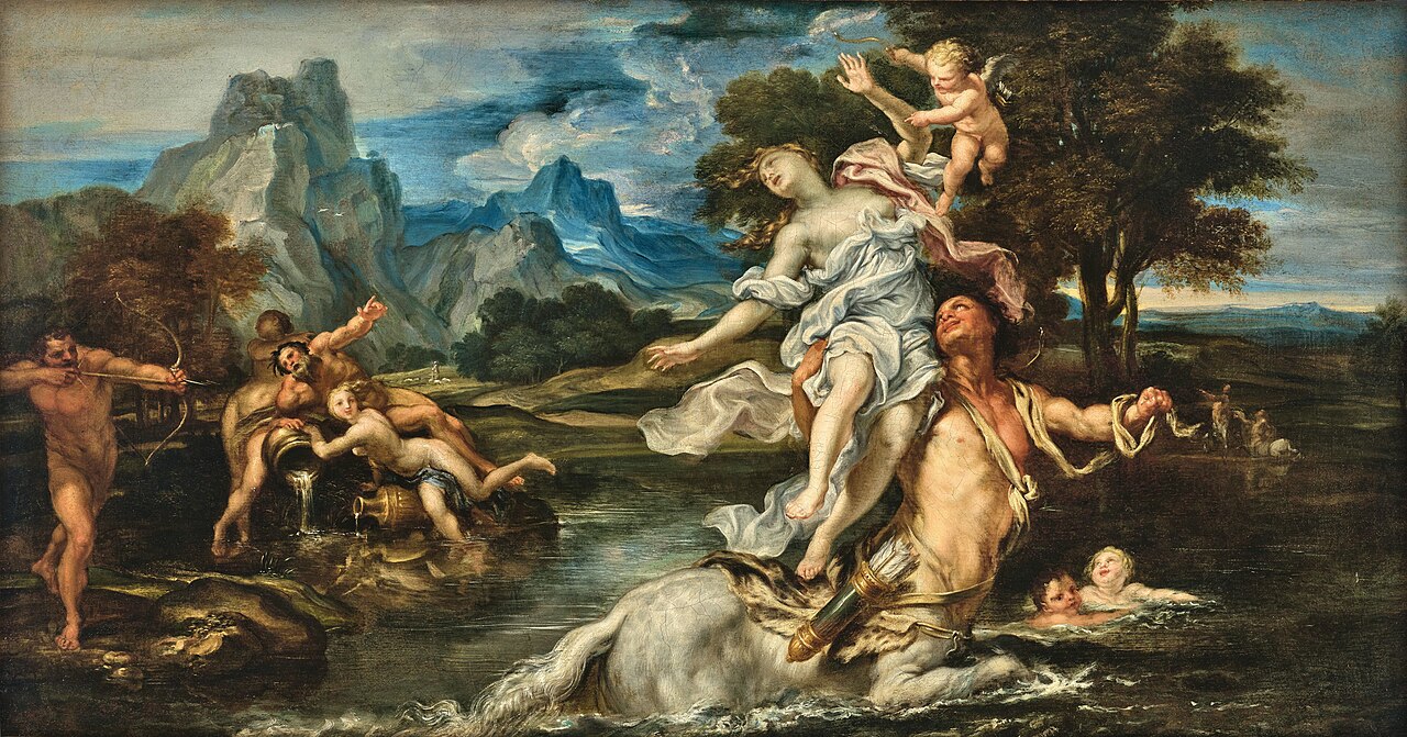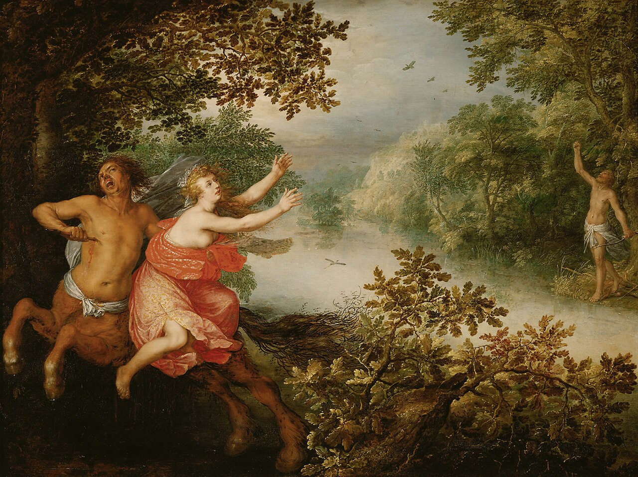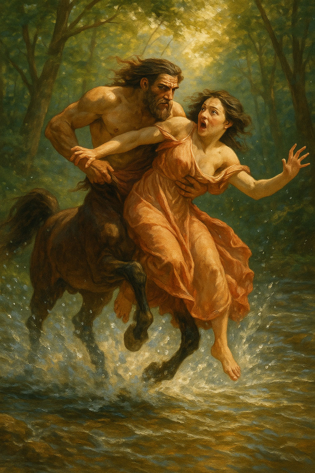 Однажды судьба направила через эту реку Геракла с супругой Деянирой. Увидев перевозчика, Геракл поленился перенести жену сам, а препоручил ее Нессу. То ли решив отомстить Гераклу за причиненное племени зло, то ли действительно воспылав внезапной страстью к женщине, Несс, переплыв поток, бросился со своей ношей наутек от замешкавшегося героя. Геракл, недолго думая, схватил лук и всадил отравленную стрелу в спину скакавшего галопом похитителя или, возможно, уже пристроившегося совершить намеченное. Яд Лернейской гидры действует почти мгновенно, но, прежде чем умереть, Несс успел нашептать Деянире, что, де, кровь кентавра — лучшее приворотное средство в древнегреческой природе.